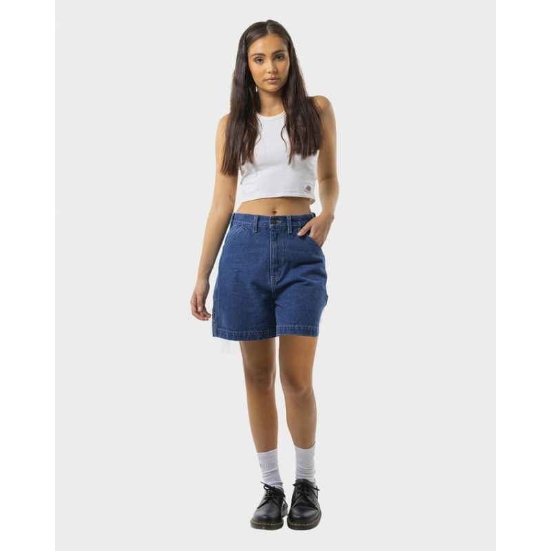 Women’s Dickies denim carpenter short with an A Line look and woven logo label, our stampof authenticity.