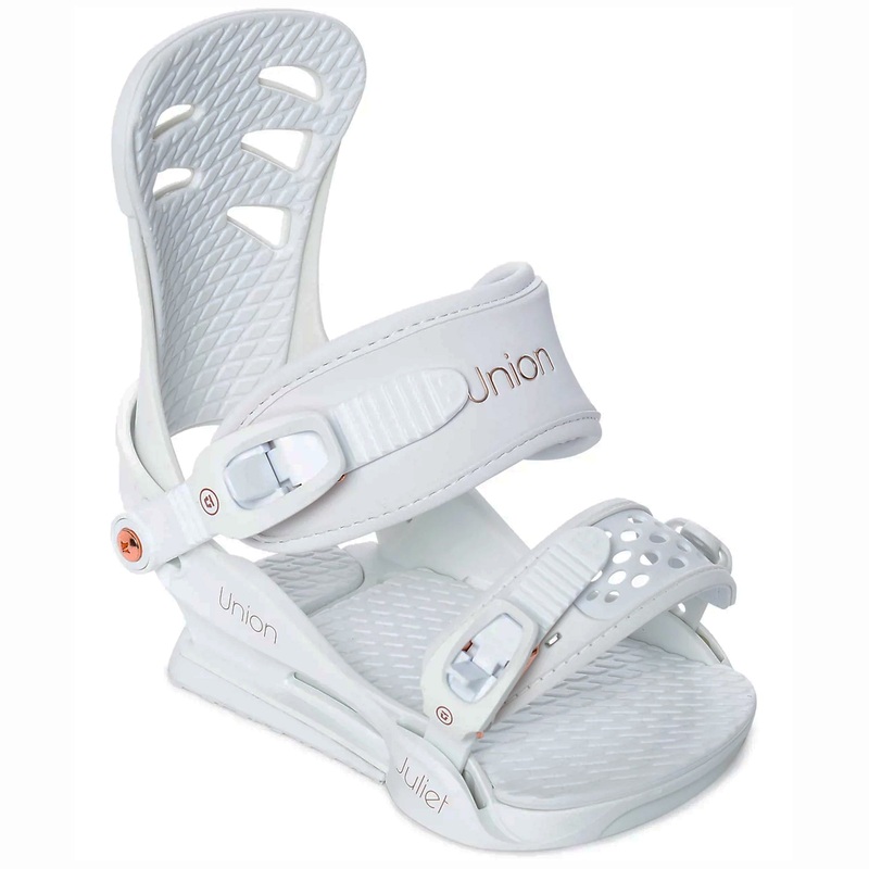 The tried and true women’s Juliet Snowboard Bindings from Union offer up a comfortable freeride-focused design for riders of all ability levels. The women’s specific ankle strap, canted footbed, and contoured Juliet Asymmetric Highbacks ensure a natural foot positioning for smoother turns and pre-loaded ollie power as well as a calf-bite-free fit that is supportive and comfortable all day. These almost matte white bindings have aluminum injected ratchets featured in a shiny rose gold color for the glamorous boarders on a budget. Union Binding Co. completed the Juliet White Snowboard Bindings with EVA foam bushings which absorb fatigue-inducing vibrations so you can ride hard from the first chair to the last.