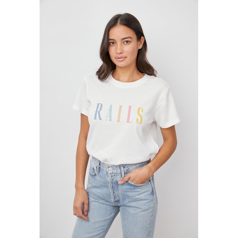 Your new go-to, this timeless white tee comes in a crewneck silhouette and features the RAILS logo in rainbow pastel colors, perfect for everyday comfort and breathability.